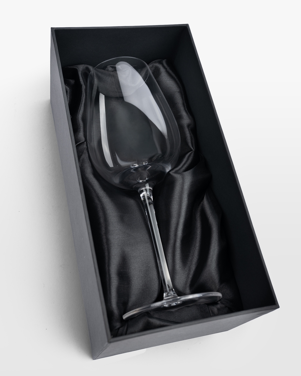 Vinglasset leveres i en elegant gaveæske, klar til at blive overrakt til modtageren.