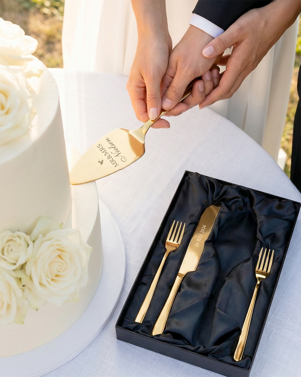 Dette elegante 4-delte sæt med tårtbestik med navn er en smuk og mindeværdig bryllupsgave, der vil følge parret gennem livet. Sættet består af en stilren tårtspade, en matchende tårtkniv og to elegante gafler i guld – alt skabt for at gøre bryllupsdagen endnu mere speciel.