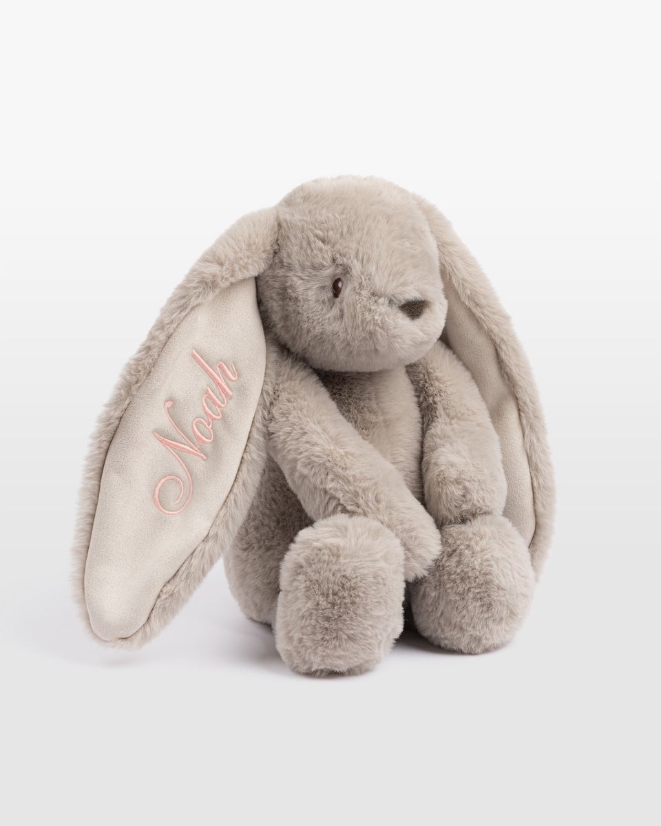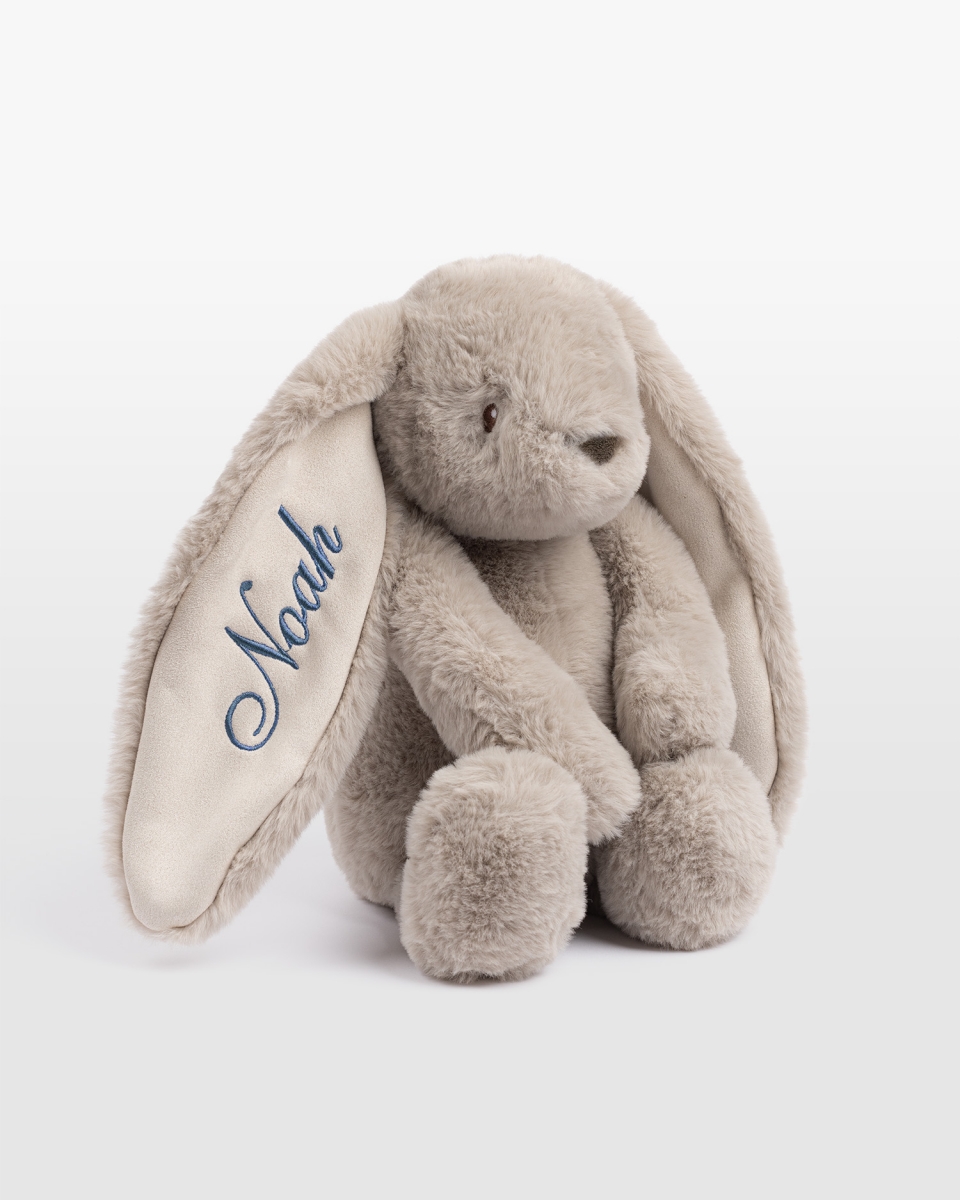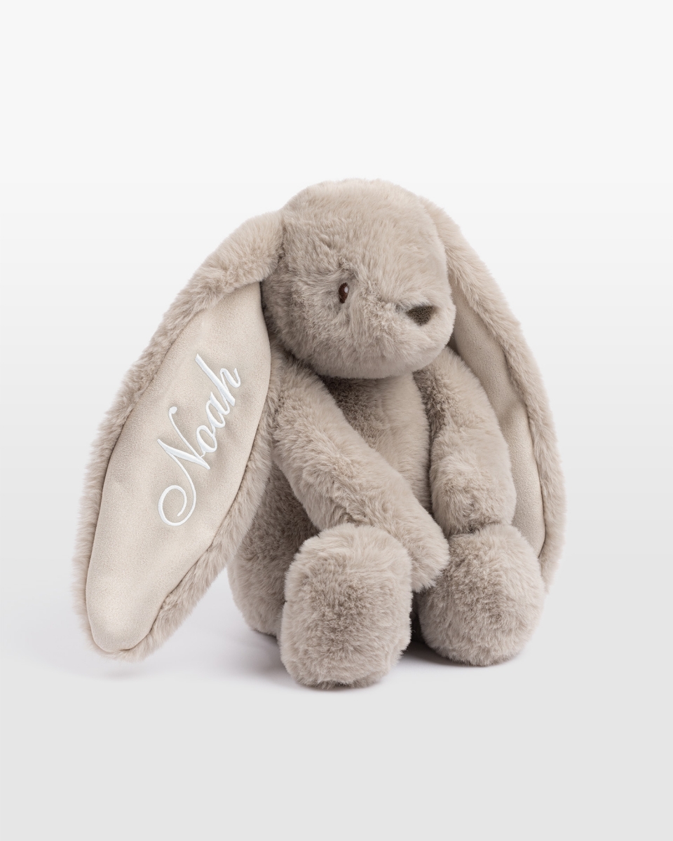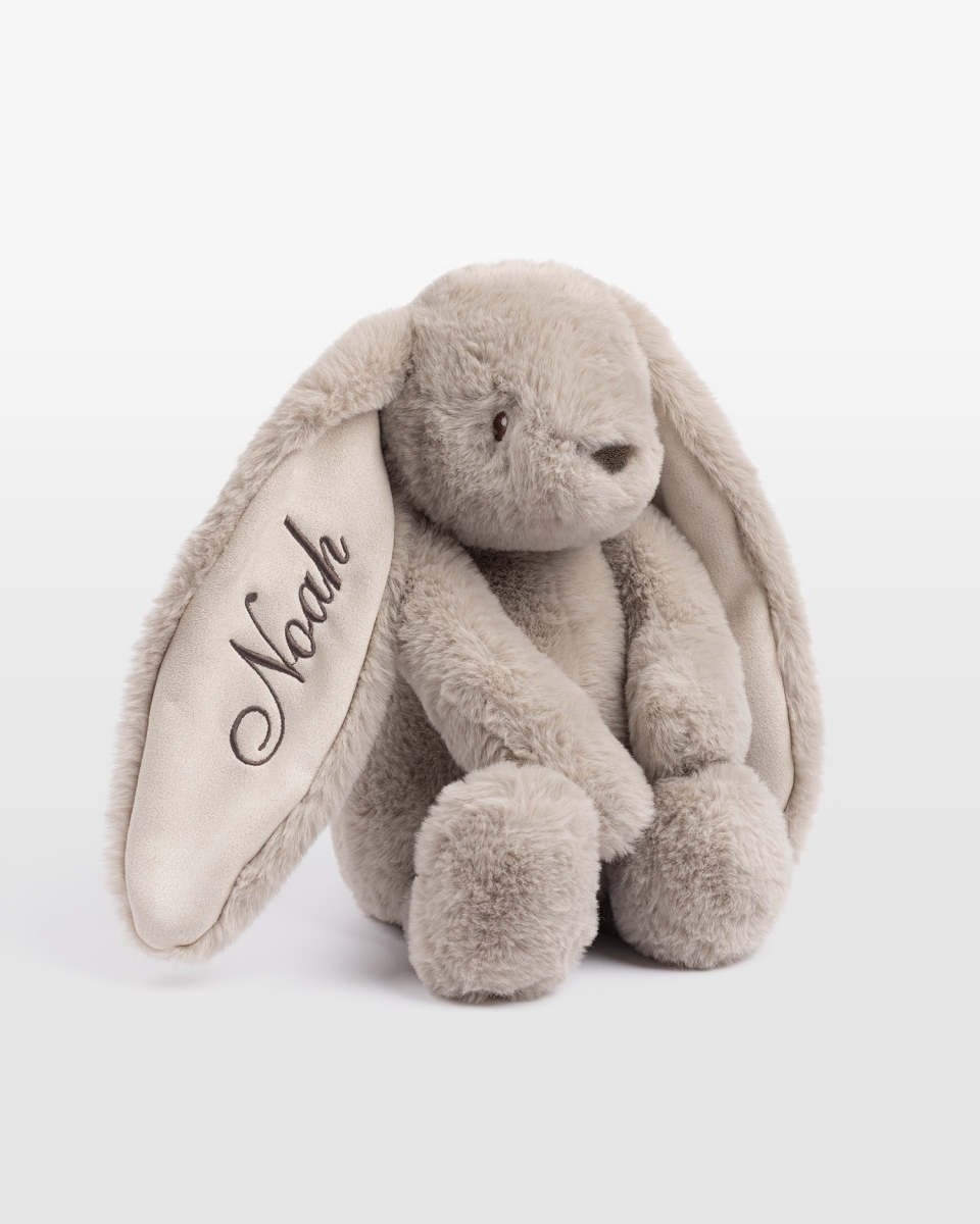 På kaninens øre broderer vi barnets navn, hvilket gør at plysdyret bliver en endnu mere mindeværdig og speciel del af barndommen.