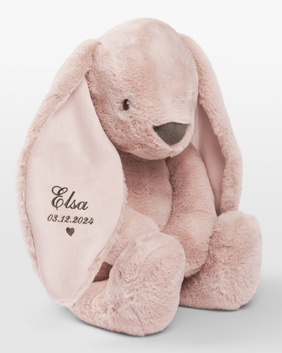Med barnets navn broderet i øret bliver denne kanin unik, og barnet vil føle et ekstra specielt bånd til den. Den store plysdyrkanin med sin bløde pels og venlige øjne indbyder til en verden af leg og sjov. Den personlige kanin vil blive en livslang kammerat, som vil følge med på de eventyr, som barndommen har at byde på.