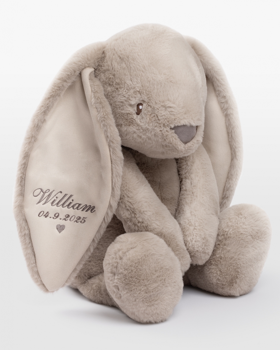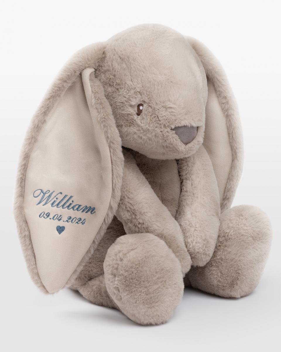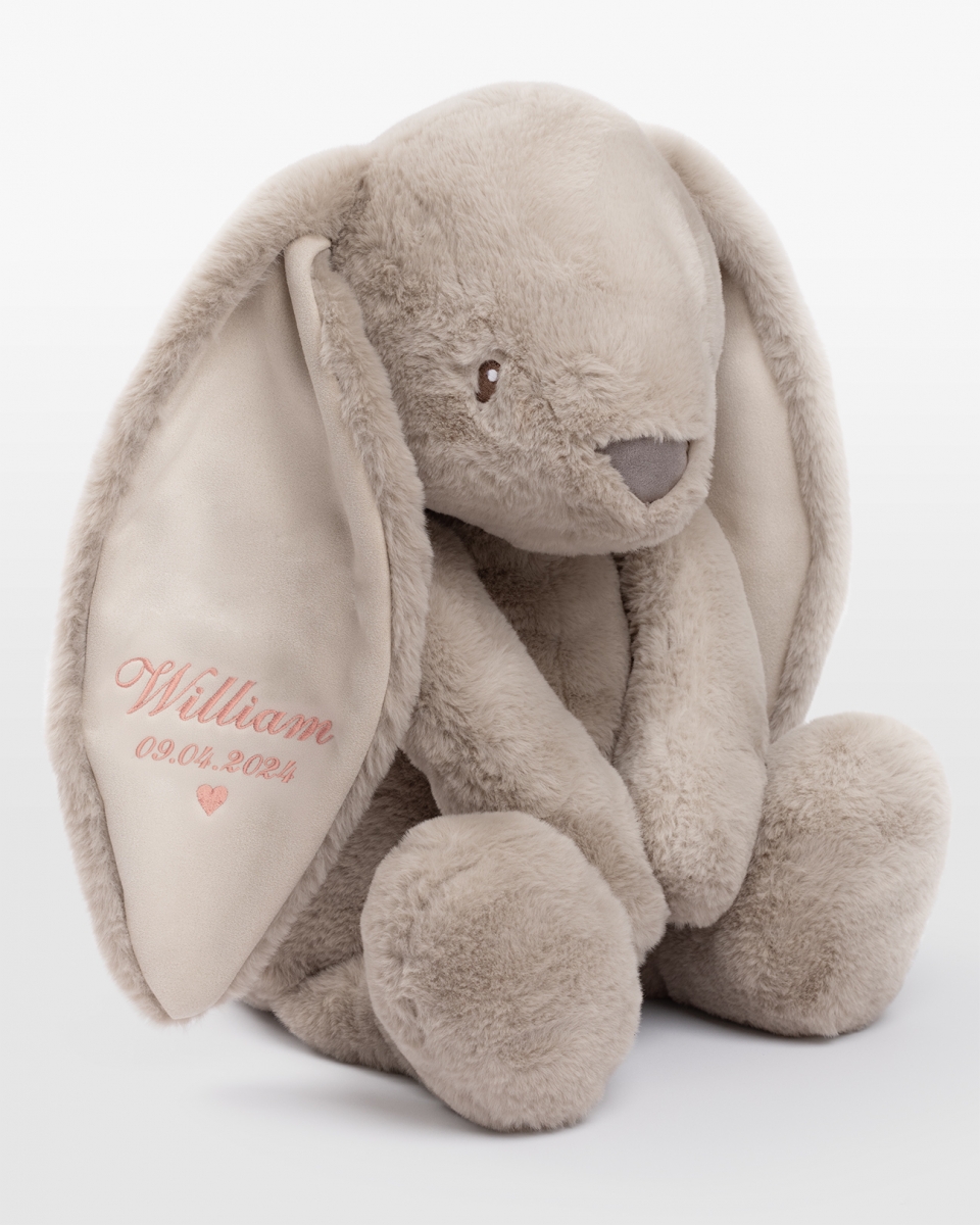 En bamse i stort format til ekstra varme og store kram. Bamsekaninen, som broderes med barnets navn i øret, vil blive en speciel og unik ven, der skaber varme minder.