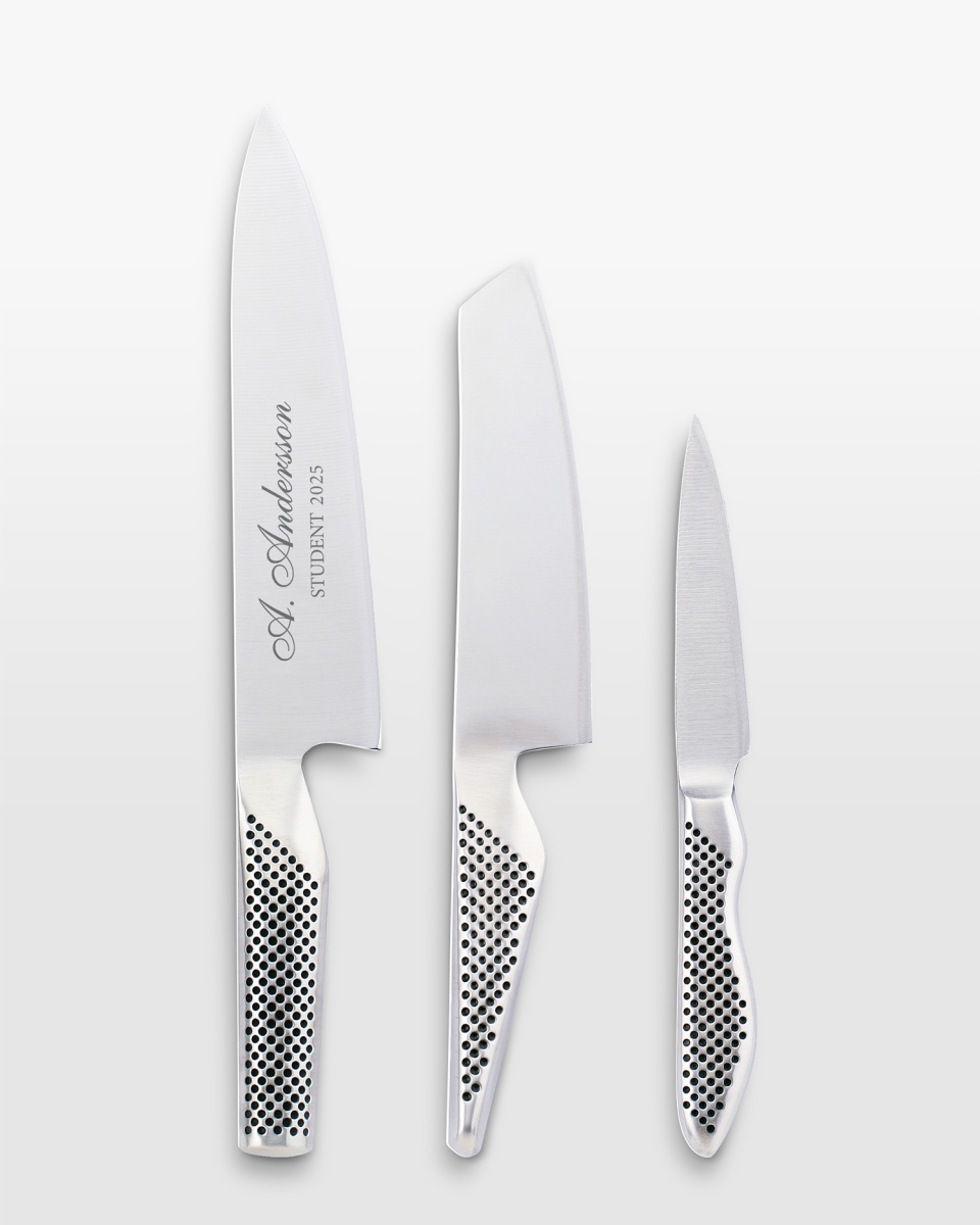 Leder du efter en mindeværdig og brugbar gave til en, der elsker at lave mad? Så er dette 3-delte sæt med Globalknive et fremragende valg. Ved at gravere kokkekniven i knivsættet med en valgfri tekst bliver det både en stilfuld og praktisk gave, som med garanti vil blive brugt dagligt.