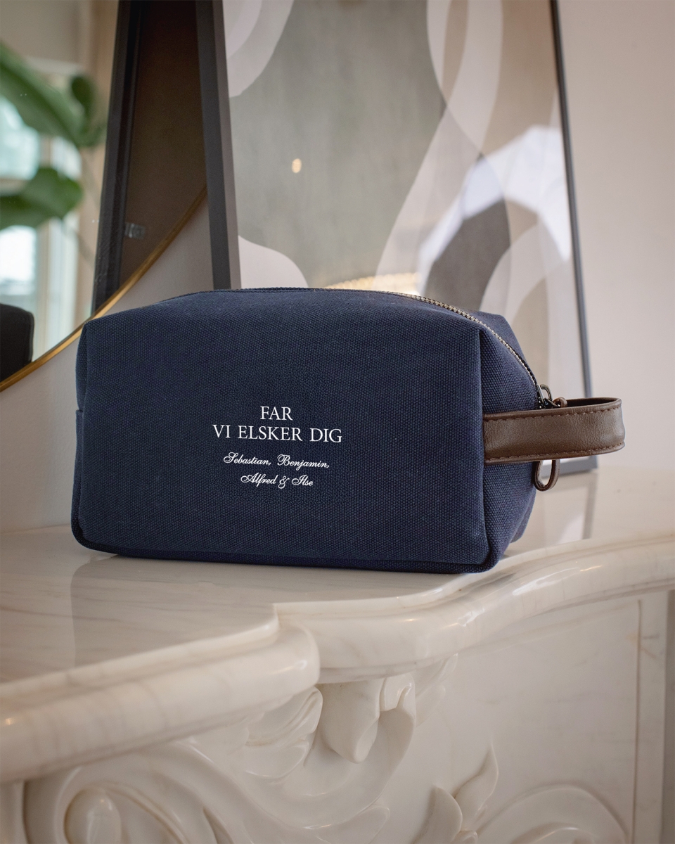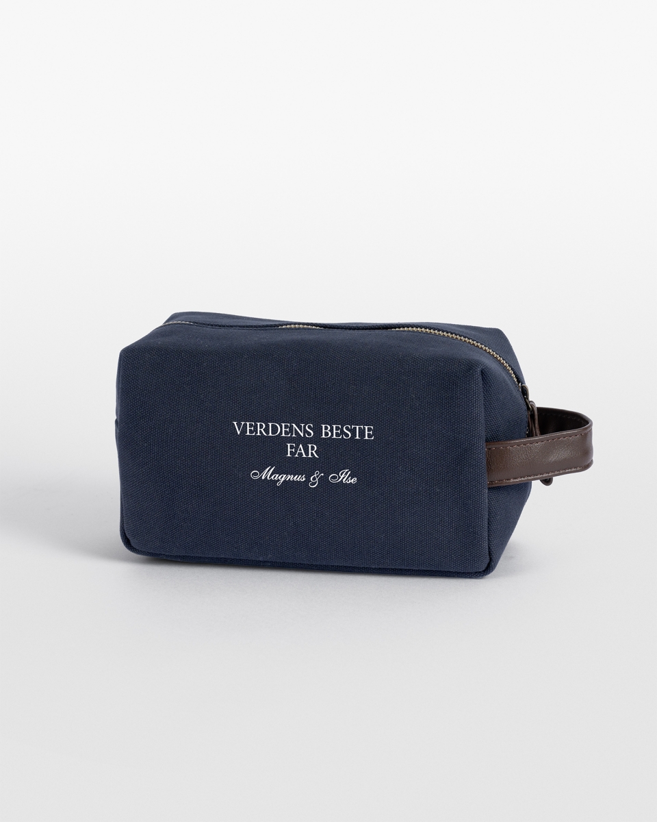 Overrask far med en personlig toilettaske i kanvasstof! Det, der gør denne toilettaske ekstra speciel, er den personlige besked med navn, der trykkes på siden af toilettasken. Du vælger selv den tekst, du ønsker på toilettasken, hvilket gør den til en personlig og betænksom gave til far på fars dag.