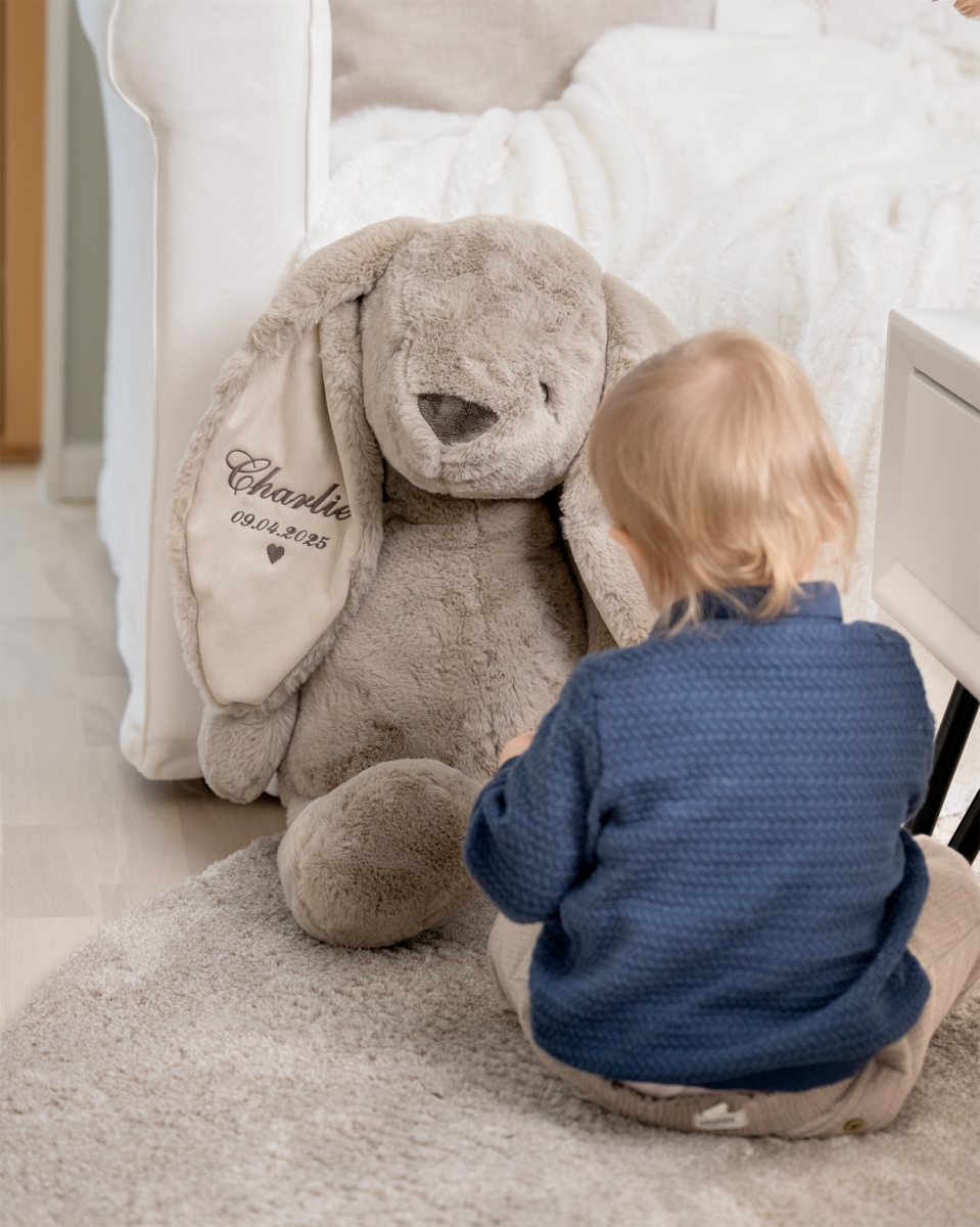 En bamse i stort format til ekstra varme og store kram. Bamsekaninen, som broderes med barnets navn i øret, vil blive en speciel og unik ven, der skaber varme minder.
