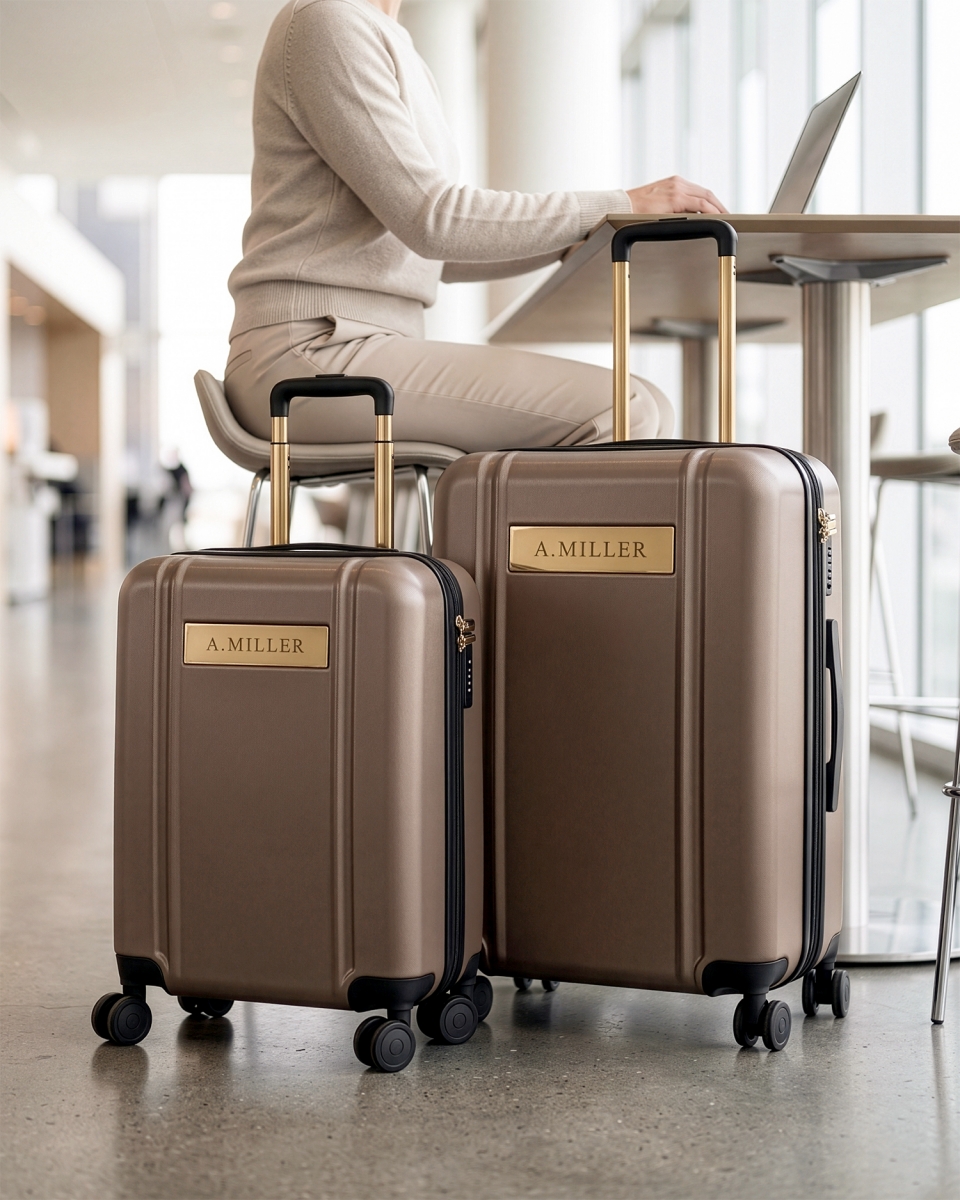 Navnet er indgravet på en metalbrik på forsiden af rejsetasken.