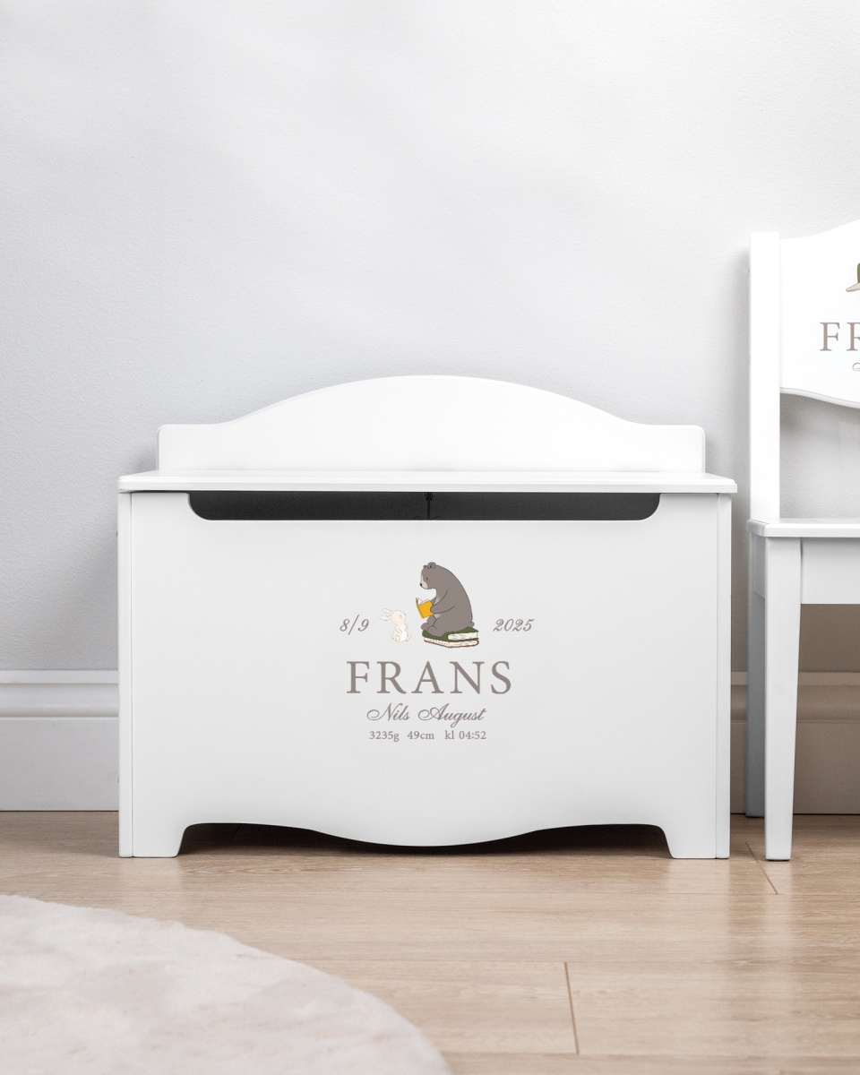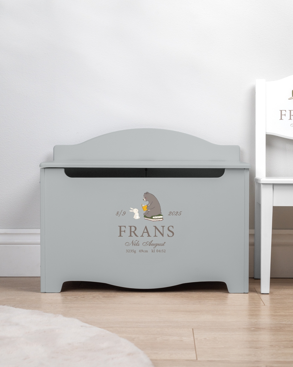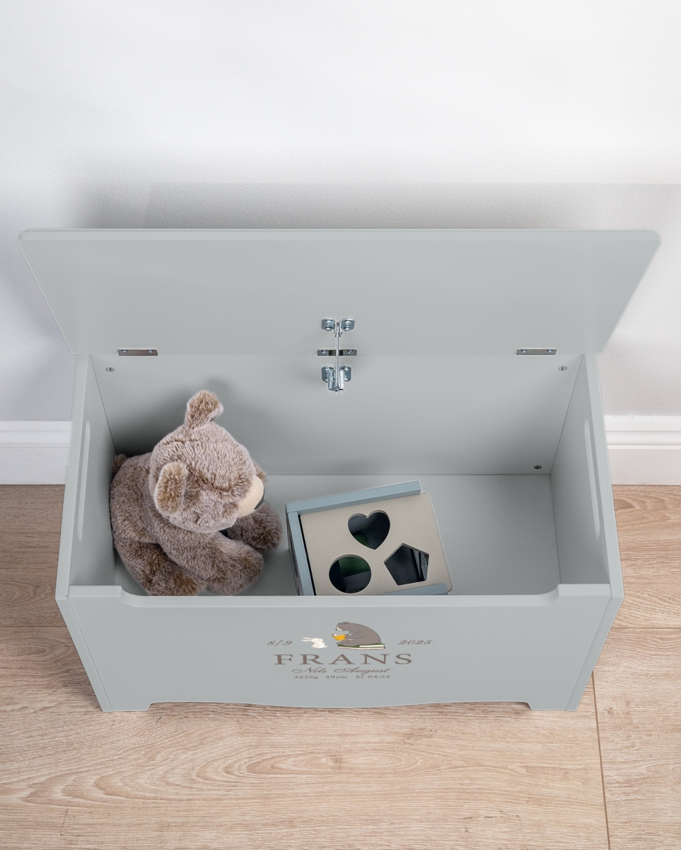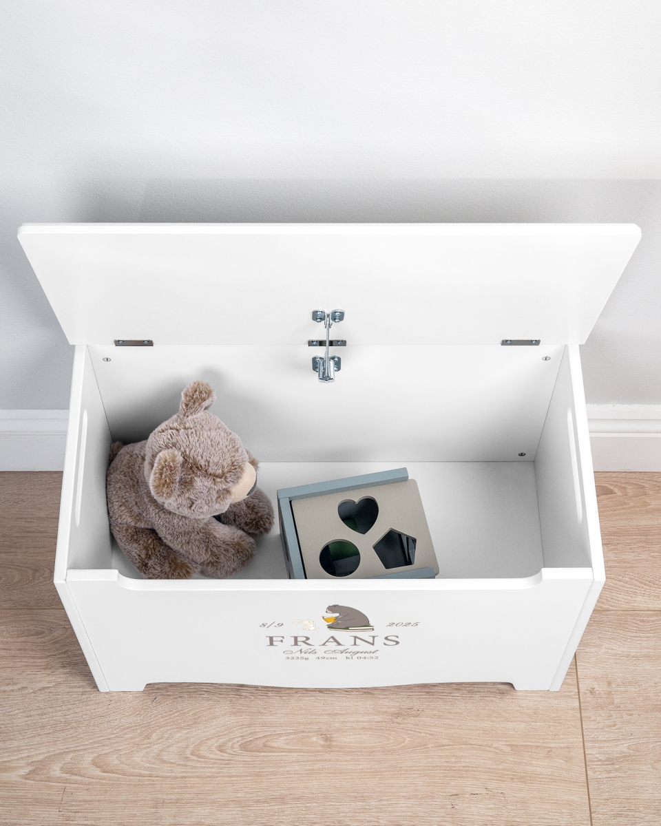 Med sit letåbnede låg og robuste design passer kisten perfekt til små hænder og er både praktisk og holdbar. Et funktionelt opbevaringsmøbel, der ikke kun holder styr på barnets ting, men også tilfører et fint og personligt præg til rummet.
