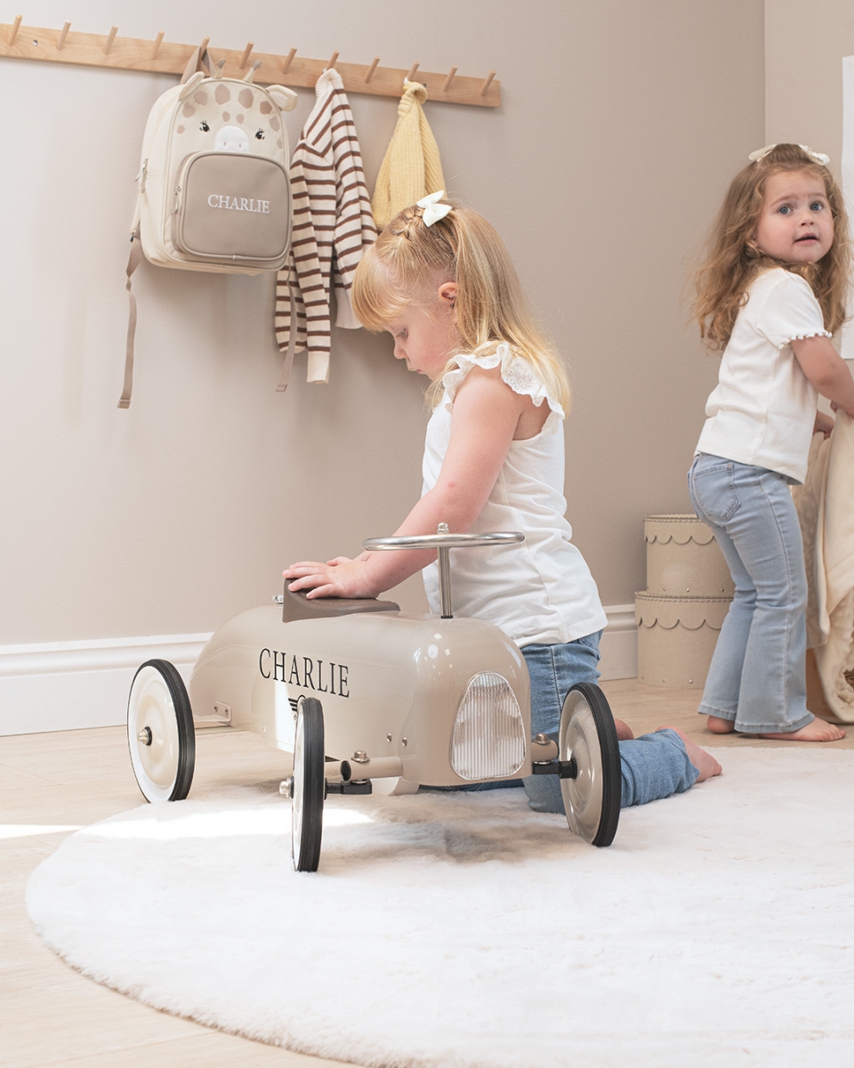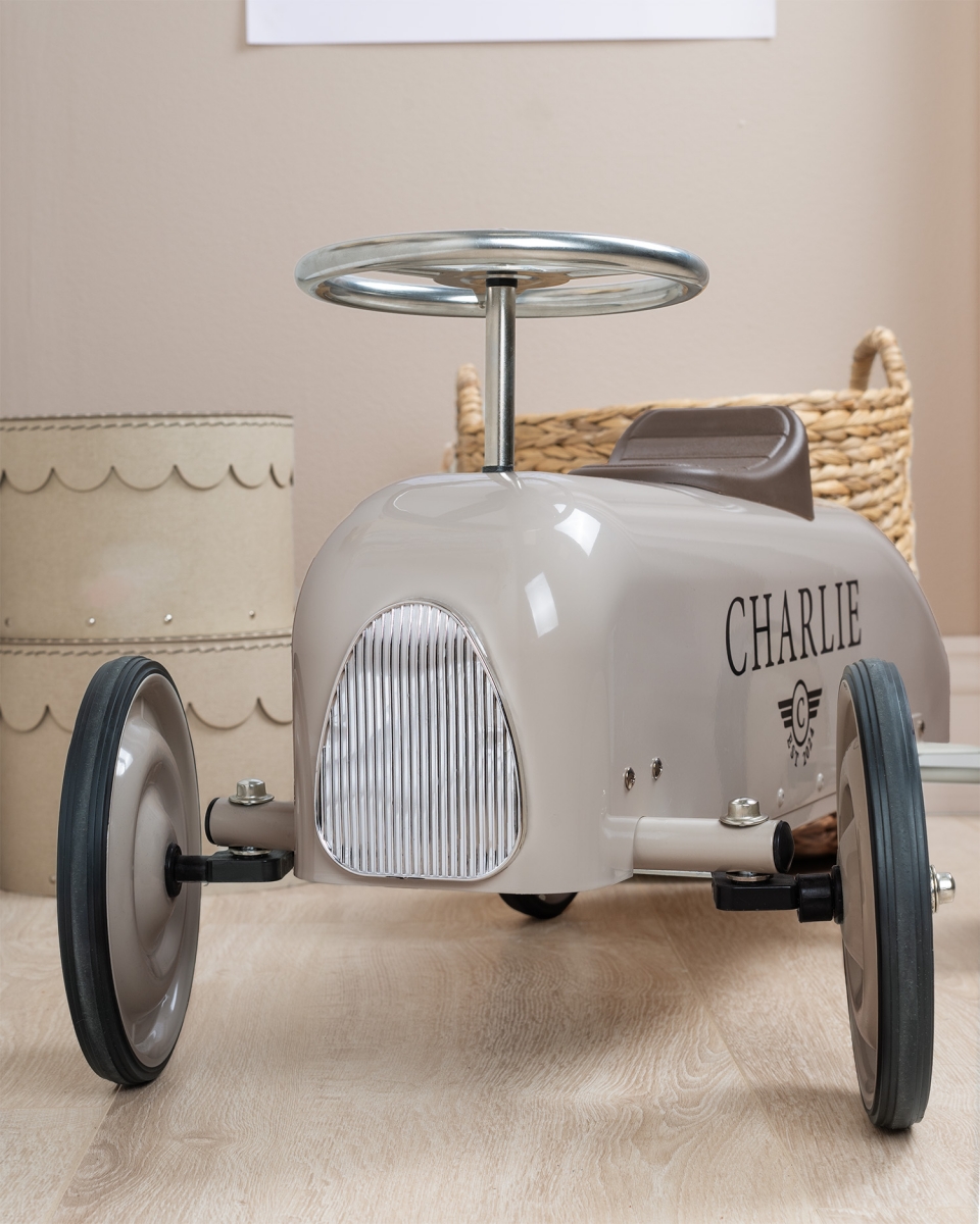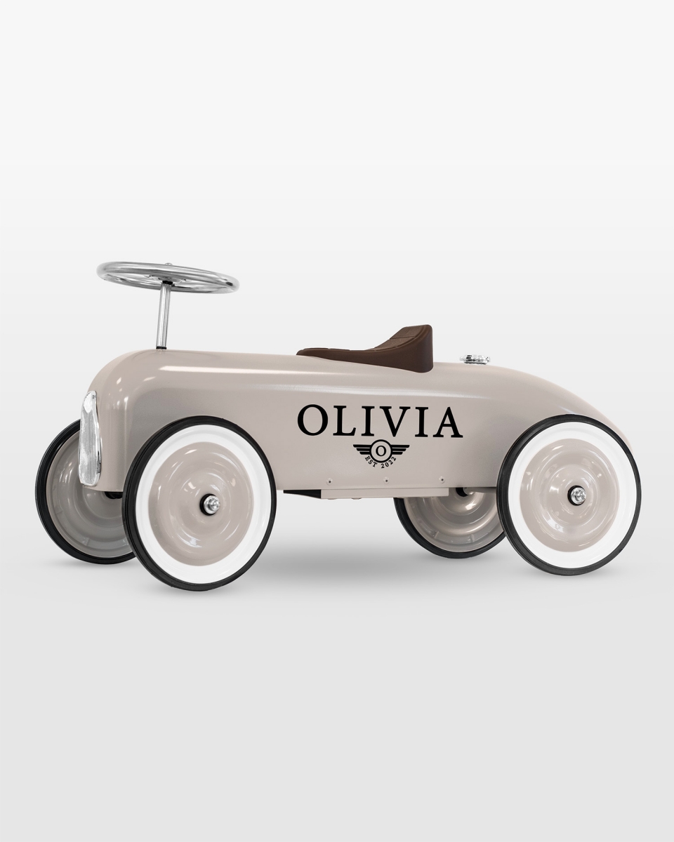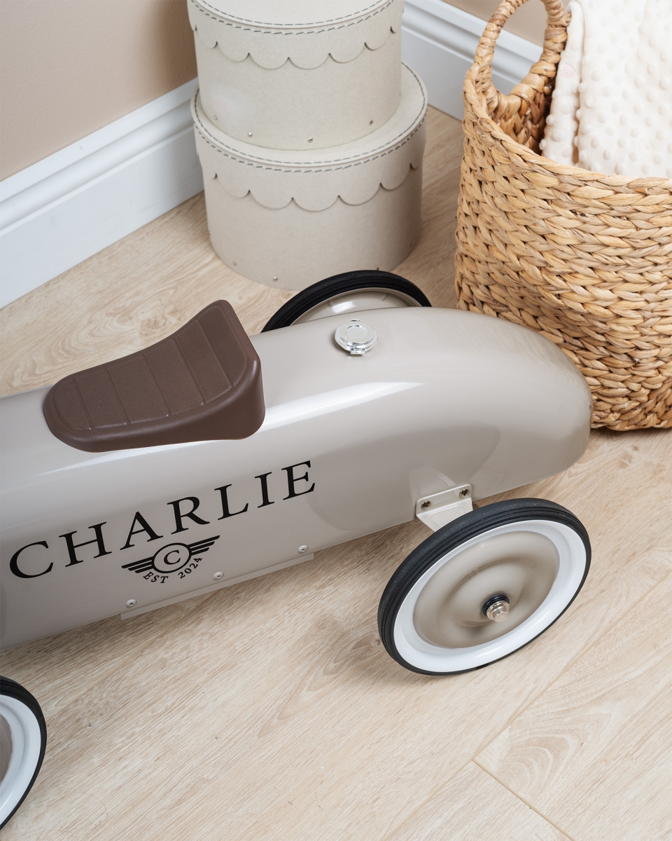 Denne robuste metalbil i sandtoner er både holdbar og let for små børn at bruge. Med sort tryk af barnets navn og årstal bliver hver bil unik og personlig, perfekt som det første eget køretøj og en mindeværdig, personlig gave.