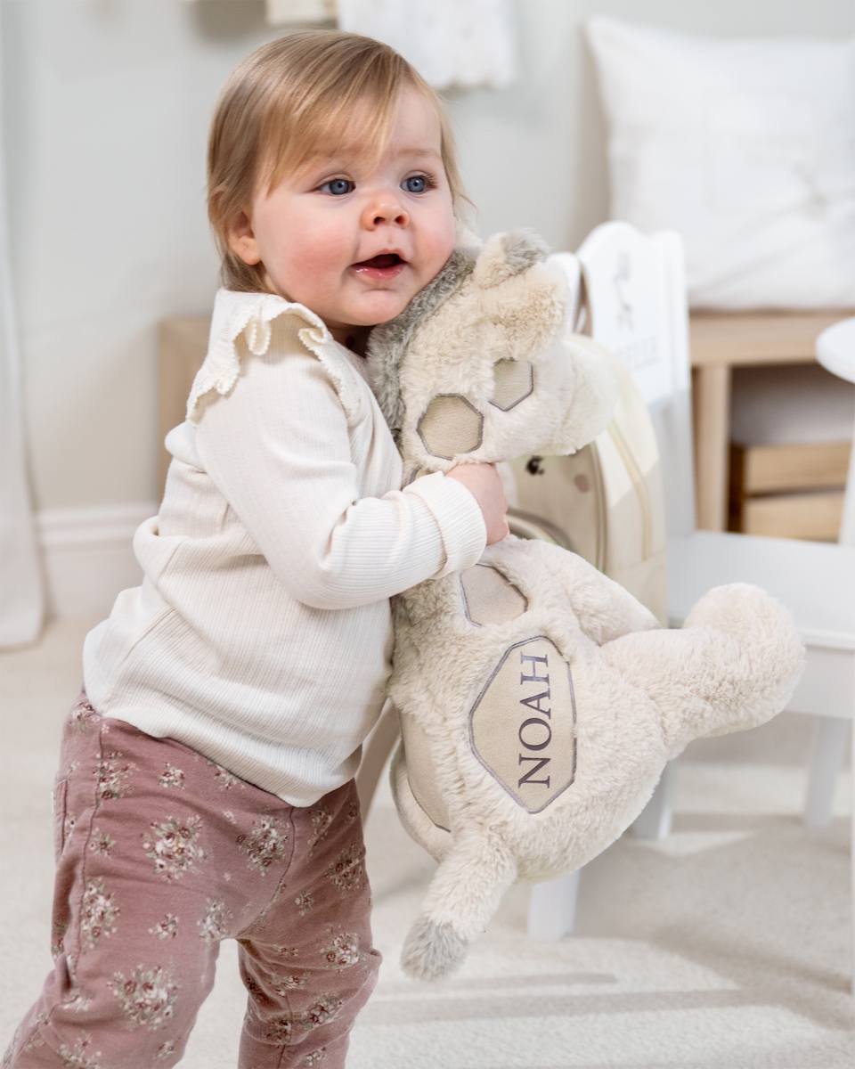 Dette bløde tøjdyr med et sødt girafmotiv bliver hurtigt en favorit hos både små og store børn. Med barnets navn på girafens tøjdyr bliver det en personlig følgesvend, der passer lige godt til dåb og navngivning som til fødselsdag.