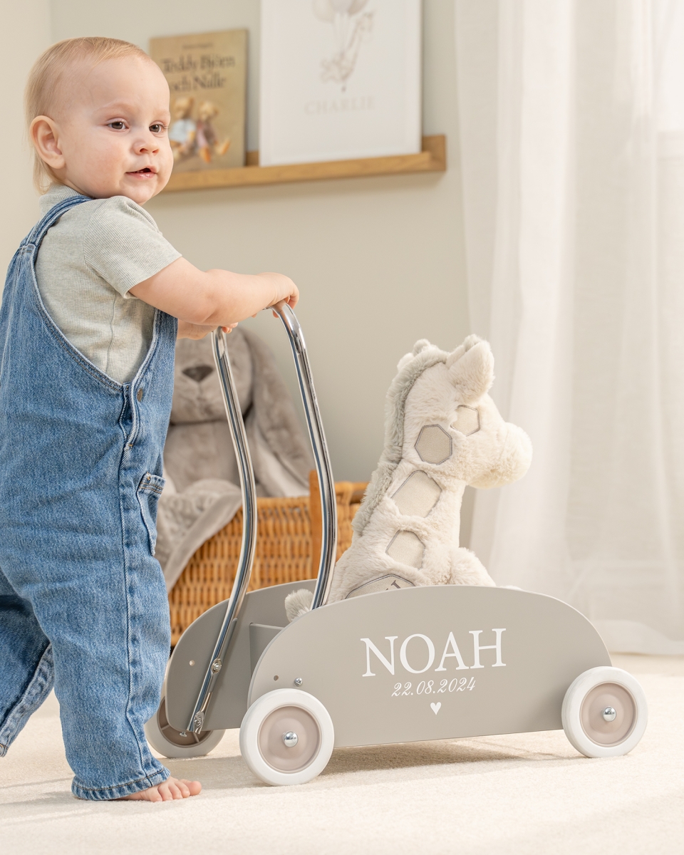 Hjælp den lille med at tage sine første skridt med denne charmerende og personlige gåvogn!