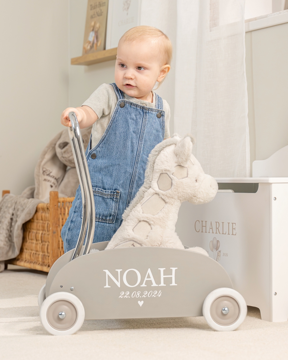 Gåvognen trykkes med barnets navn og fødselsdato, hvilket gør den både unik og mindeværdig. Gåvognen støtter barnets udvikling, men bliver også et kært minde at bevare fra barndommen.