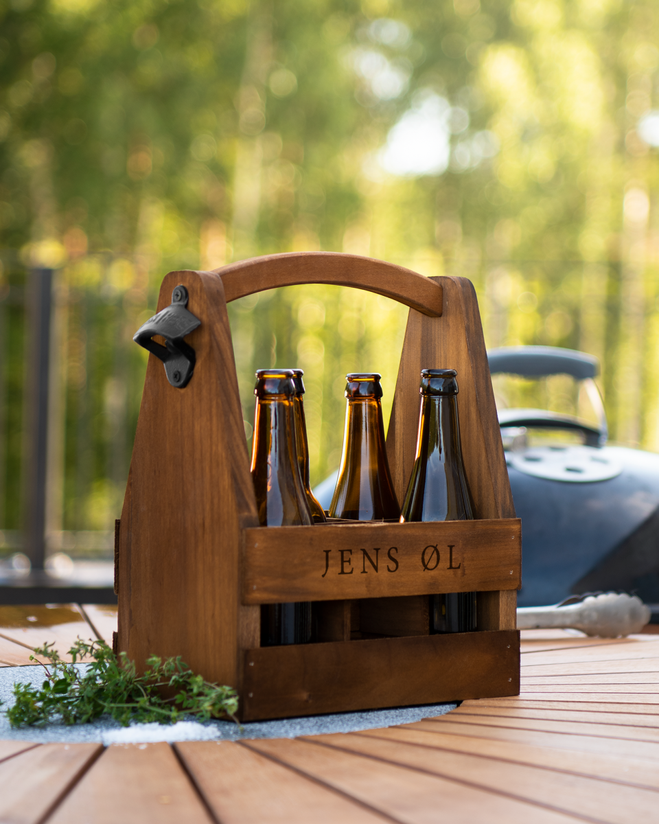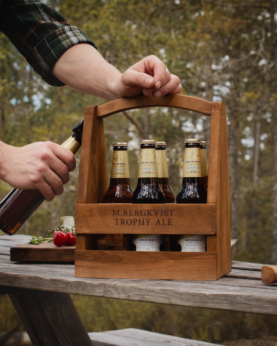 Personligt indgraveret ølkurv i træ med plads til 6 stk. 33 cl-flasker.