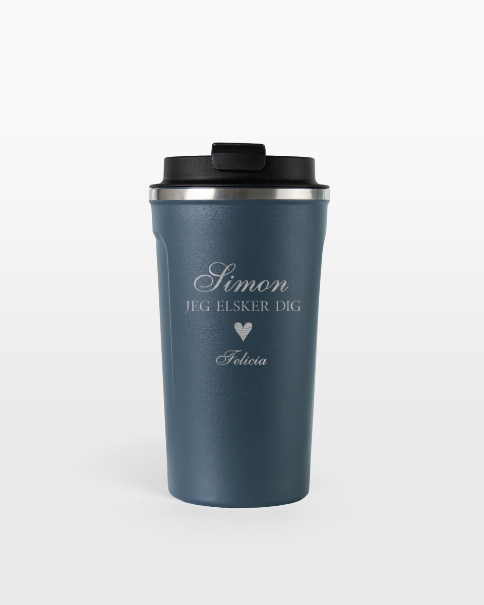 En praktisk og stilren termokrus i blåt, graveret med et valgfrit navn og budskab. Lige så populær, som den er anvendelig.